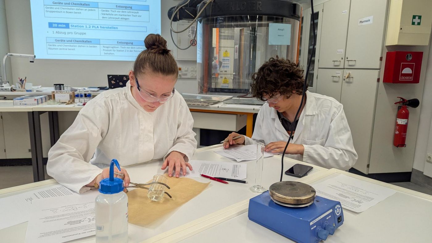 Am Freitag, den 4. Juli 2025, hatten wir, der Chemiekurs der Q12, dank der Organisation von Frau Barisch die Möglichkeit, unsere Chemieräume für einen Tag gegen ein Labor der Chemiefakultät der Universität Regensburg zu tauschen. Gemeinsam mit Frau Barisch und Herrn Hutschenreuther durften wir an einem Schülertag unter der Leitung des angehenden Lehrers Herrn Ade sowie Frau Dr. Telser teilnehmen. Hierbei haben wir uns mit dem Thema „Kunststoffe und Nachhaltigkeit“ auseinandergesetzt und haben dazu zunächst mithilfe einer Präsentation dem Aufbau von Kunststoffen erklärt bekommen. Anschließend durften wir in Kleingruppen zahlreiche, spannende Versuche durchführen, mit welchen wir im Rahmen des normalen Schulalltags aus Sicherheitsgründen nie in Kontakt gekommen wären. So durften wir unter anderem eine Folie aus Stärke selbst herstellen oder Styropor mithilfe von chemischem Recycling auflösen und daraufhin wieder herstellen.