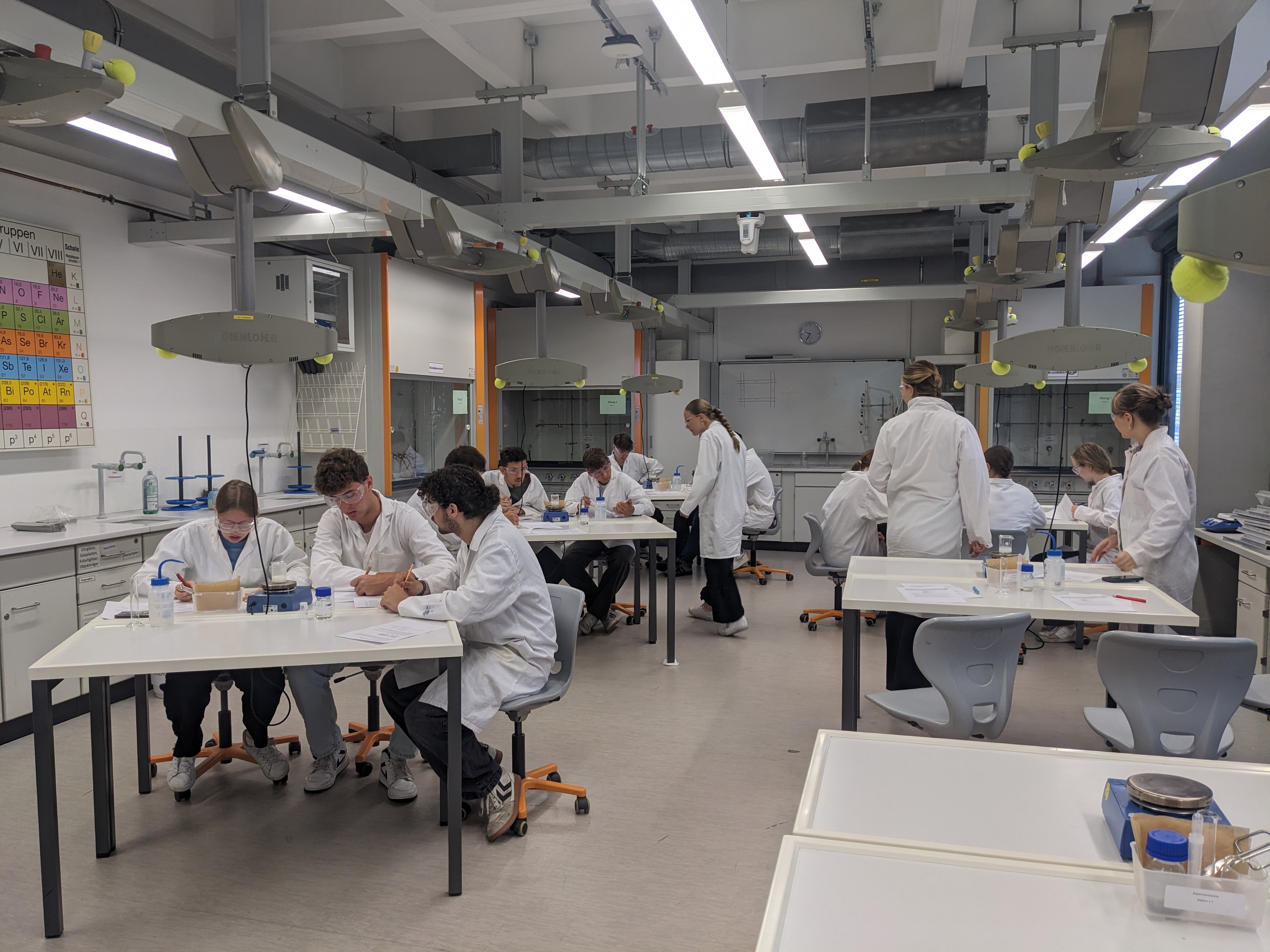 Während dieser Versuche gab es immer wieder kleine Dokumentationsaufgaben, die dazu dienten, die neu erlernten Informationen weiter zu veranschaulichen sowie zu erläutern. Außerdem hatten wir in einer kurzen Pause auch noch die Gelegenheit, ein weiteres Labor der Chemiefakultät zu besichtigen, wobei uns anschaulich verschiedene Maschinen und Techniken erklärt wurden, die hier zum Einsatz kommen.