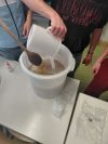 Zuerst musste das vorher abgewogene Malz geschrotet werden, was jeder einmal ausprobieren durfte, um schließlich mit dem Maischen zu beginnen. Während unser ,,Brauwasser-Malz-Gemisch“ auf verschiedenen Temperaturen ein wenig vor sich hin köchelte, nutzten wir diese sogenannten Rastphasen, in denen die Enzyme unsere Arbeit übernahmen, um einen passenden Namen für unser Weißbier zu finden. Zwischen ,,Hutschis Schaumkanone“ und ,,Hutschi und der Schaum der Weißen“ stimmten wir knapp für den Namen ,,Bildungsbunker Weiße“ ab. Danach stärkten wir uns noch mit einem frühen Mittagessen vom Döner und arbeiteten daraufhin ganz fleißig weiter. Denn jetzt erfolgte die Iod-Probe, um herauszufinden, ob die Enzyme ihre Arbeit auch gut gemacht hatten. Zum Glück fiel diese negativ aus, so konnten wir mit dem Abmaischen und Läutern weitermachen, bei dem die Würze vom Treber, also dem festen Überbleibsel, getrennt wurde. Der Treber, den man eigentlich auch essen könnte, fand bei einigen von uns eher die Funktion als Knete und sorgte so für ein paar Lacher.
