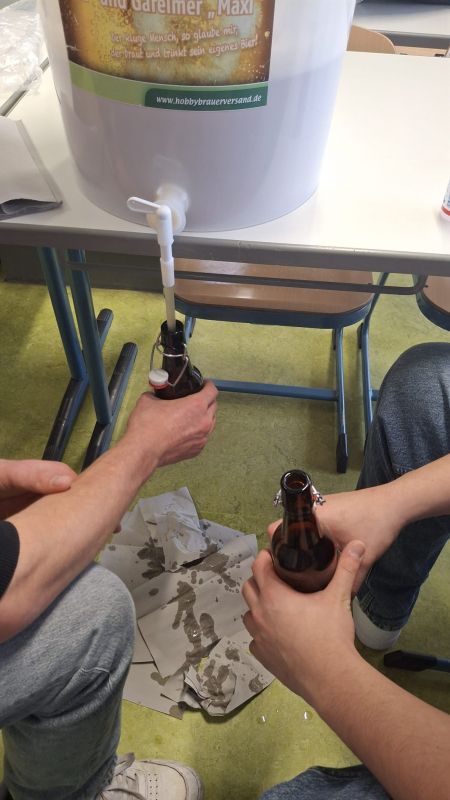 Endlich hatte unser Warten ein Ende. Endlich war unser selbstgebrautes Bier fertig vergoren, die Hefe hatte ihre Arbeit verrichtet und nun konnten wir mit dem Abfüllen in die Flaschen beginnen. Nach einer einleitenden Hygieneanweisung durch Herrn Hutschenreuther konnten wir damit beginnen, das Bier von der abgesunkenen Hefe zu trennen, indem man die Flüssigkeit vorsichtig abgießt. Das nennt man dekantieren. Schlussendlich hatten wir 17 Liter mit 6,25 % Alkohol von unserem eigenen Bier, welches aber nun nach dem langen Gärprozess seine Kohlensäure verloren hatte und völlig abgestanden schmeckt. Um das zu kompensieren muss das Bier noch einmal aufkarbonisiert werden. Dazu gaben wir 240 g Traubenzucker hinzu, welcher dazu führt, dass die Hefe in den Flaschen wieder neue Kohlensäure bildet. Zum Abschluss wurden Gärbottich und sonstige Ausrüstung wieder gesäubert und aufgeräumt.