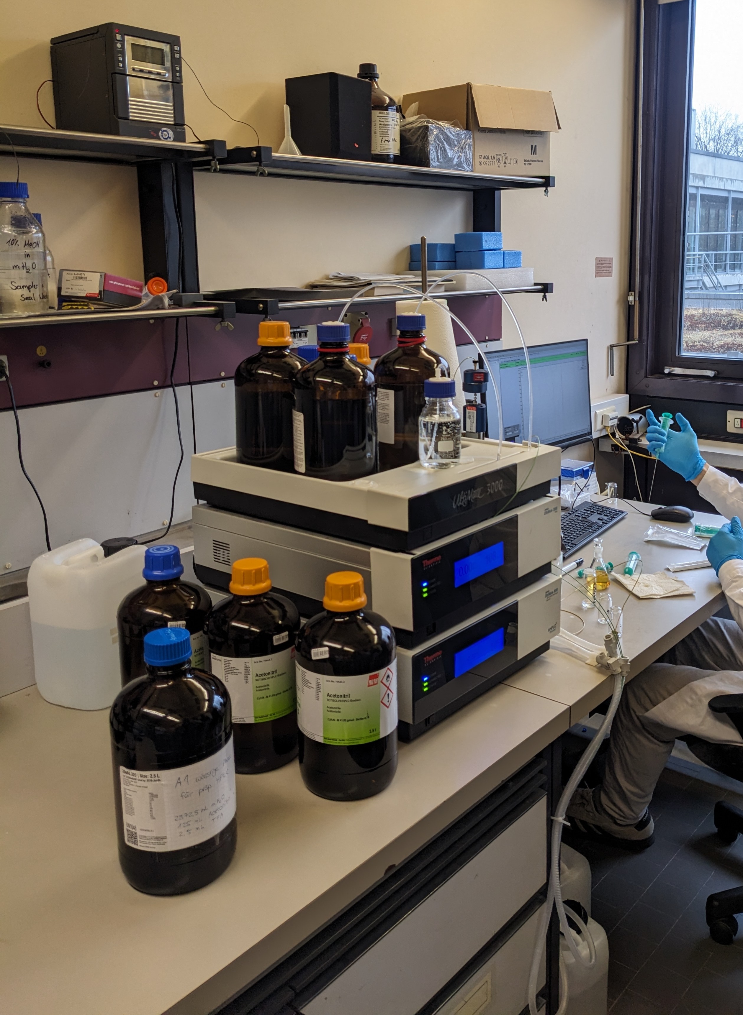 Während dieser Versuche gab es immer wieder kleine Dokumentationsaufgaben, die dazu dienten, die neu erlernten Informationen weiter zu veranschaulichen sowie zu erläutern. Außerdem hatten wir in einer kurzen Pause auch noch die Gelegenheit, ein weiteres Labor der Chemiefakultät zu besichtigen, wobei uns anschaulich verschiedene Maschinen und Techniken erklärt wurden, die hier zum Einsatz kommen.
