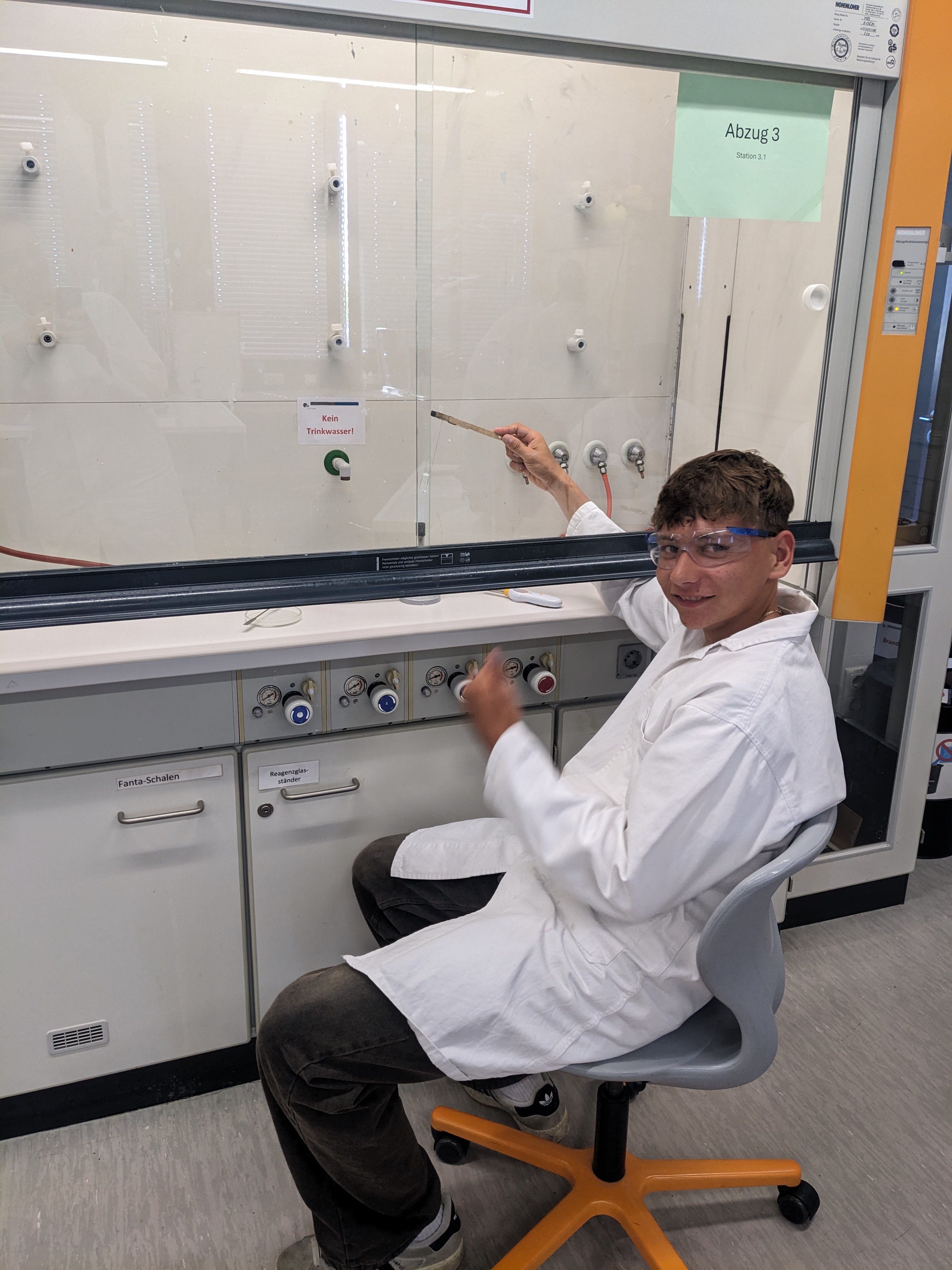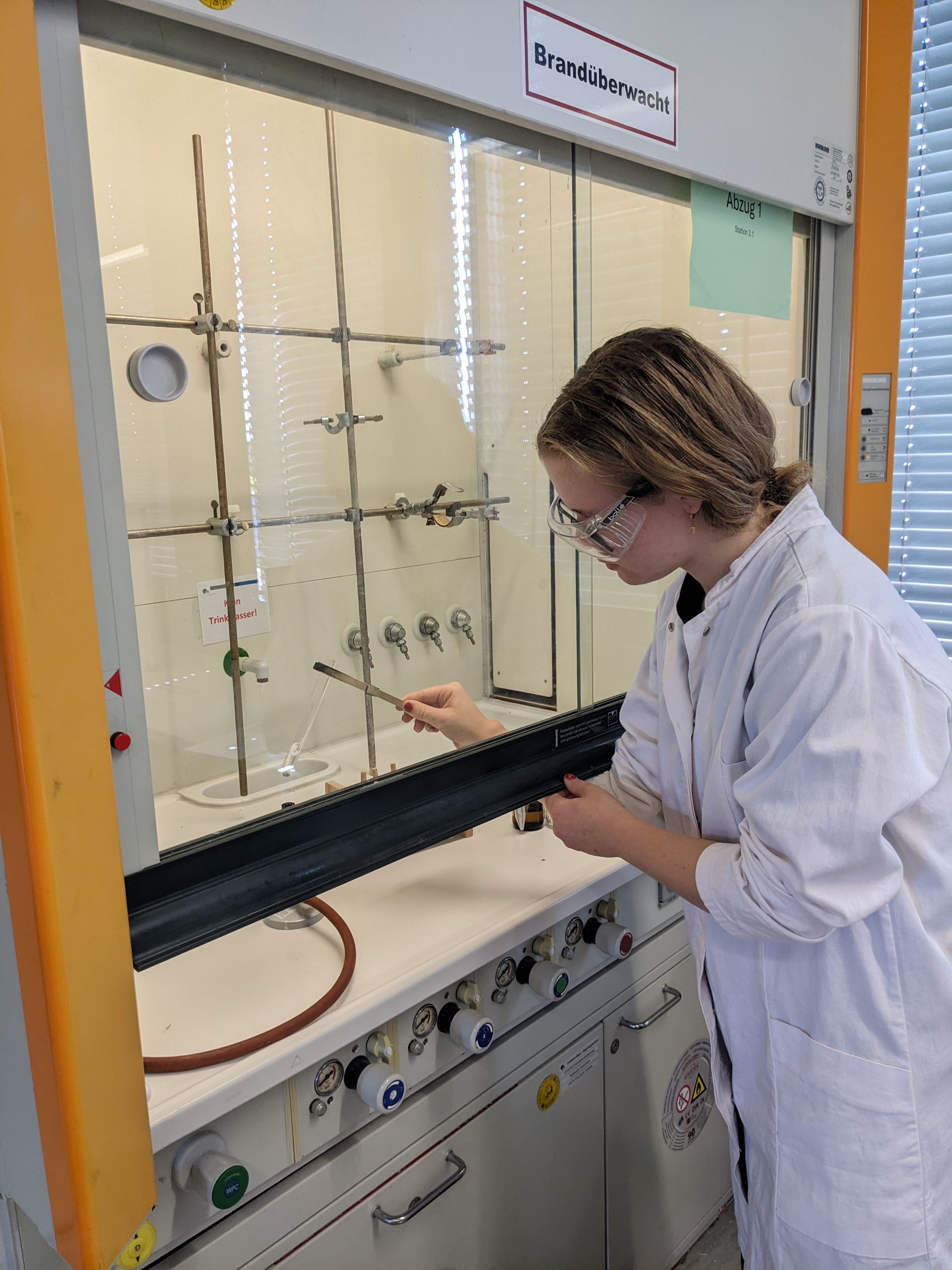 Während dieser Versuche gab es immer wieder kleine Dokumentationsaufgaben, die dazu dienten, die neu erlernten Informationen weiter zu veranschaulichen sowie zu erläutern. Außerdem hatten wir in einer kurzen Pause auch noch die Gelegenheit, ein weiteres Labor der Chemiefakultät zu besichtigen, wobei uns anschaulich verschiedene Maschinen und Techniken erklärt wurden, die hier zum Einsatz kommen.